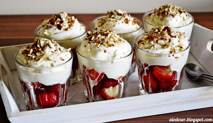 Truskawki z musem z białek i śmietanki z dodatkiem likieru amaretto, posypane siekanymi migdałami.