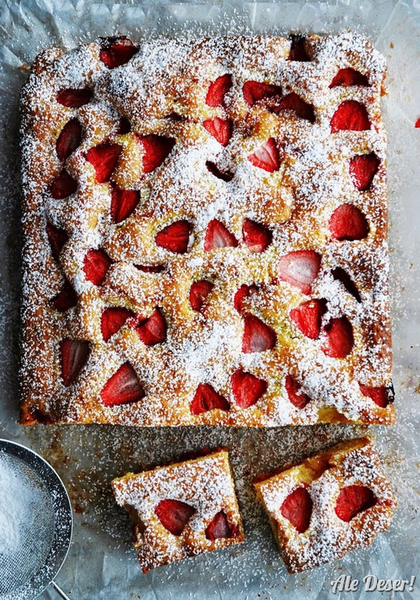 Puszyste, maślane ciasto ucierane z dużą ilością świeżych truskawek. Nie jest bardzo gęste, dlatego owoce mogą wpaść do środka w trakcie pieczenia :) Przepis pochodzi z książki "Radość gotowania".