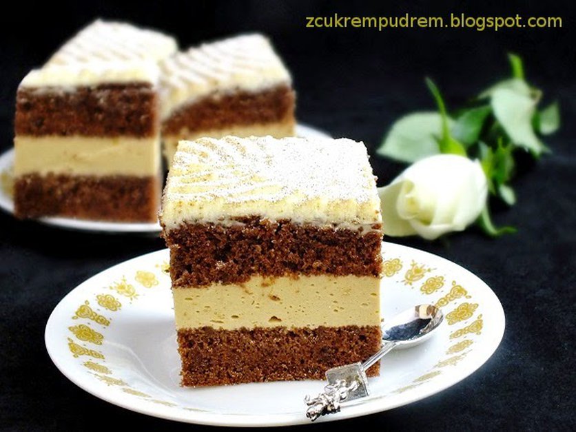Krem wyłożyć na naponczowany blat, przykryć drugą częścią ciasta, lekko docisnąć, schłodzić w lodówce.