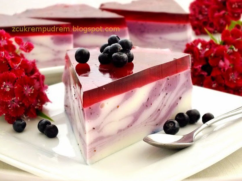 Do przestudzonej żelatyny dodać 2 łyżki masy jagodowej, wymieszać, wlać do całości, zmiksować na najszybszych obrotach, masę wstawić do lodówki.