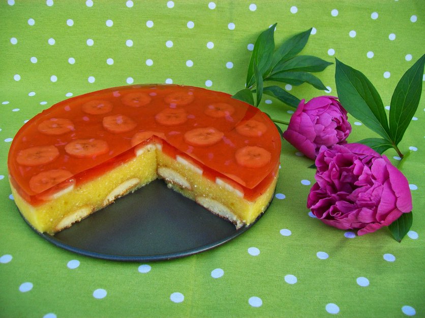 Przygotować galaretki. W jednym garnuszku rozpuścić dwie galaretki cytrynowe w 0,5 l wody, w drugim garnuszku przygotować galaretkę o dowolnym smaku, u mnie truskawkowa. Odstawić do wystudzenia. Dno tortownicy o średnicy 24 cm wyłożyć biszkoptami. Masło utrzeć z cukrem waniliowym i żółtkiem. Następnie dodać 4 starte na grubych oczkach banany. Wszystko wymieszać mikserem i dodać tężejące galaretki cytynowe. Ponownie wszystko wymieszać. Masę przelać do tortownicy i odstawić do stężenia. Następnie na wierzchu ciasta ułożyć pozostałe pokrojone banany i zalać galaretką. Odstawić do stężenia.