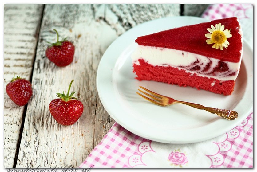 Truskawkowe szaleństwo jeszcze trwa.. U mnie też truskawkowo.. To ciasto przygotowałam mężowi z okazji jego urodzin i imienin.. Z uwagi na to, że ostatnio nie miałam za wiele czasu i sił, postanowiłam wybrać jeden z tych szybkich i pysznych wariantów. Biszkopt idealny, puszysty, o truskawkowym zabarwieniu. Sernik jedwabiście gładki, poprzecinany prążkami truskawkowej galaretki, niczym truskawkowa zebra. Wykończony glazurą truskawkową. Po pierwszym kawałku, musiałam sobie dokroić drugi .. no po prostu musiałam ..