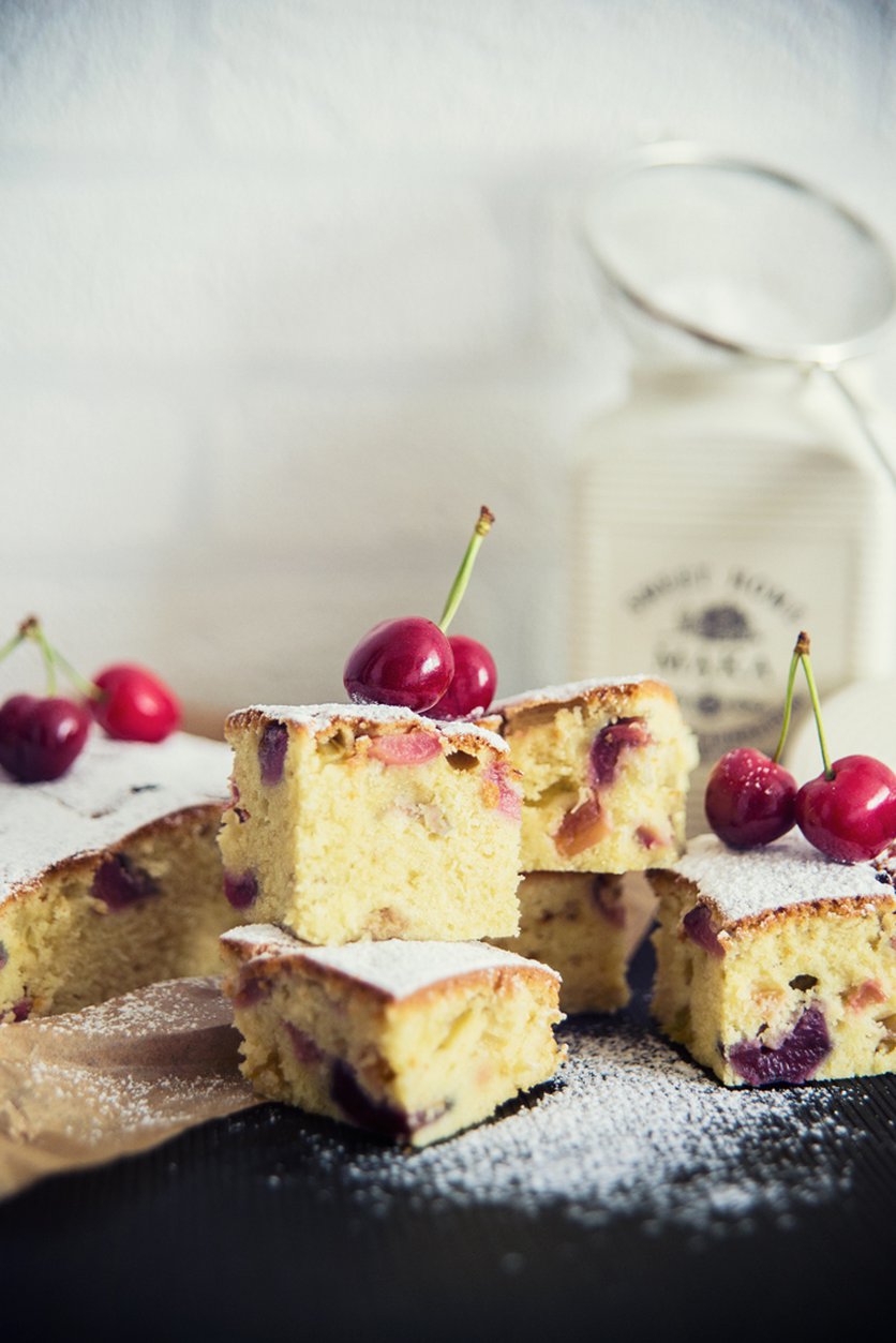 Ciasto wylewamy do formy i pieczemy w temp. 200C przez ok. 45minut. Po upieczeniu posypujemy cukrem pudrem i dekorujemy świeżymi czereśniami.