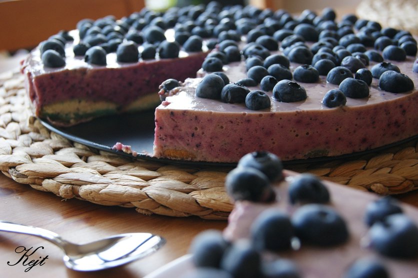 W miseczce rozpuszczamy galaretkę w 1,5 szklanki gorącej wody i ostudzamy. Dno tortownicy wykładamy papierem do pieczenia. Biszkopty moczymy w galaretce i wykładamy nimi spód tortownicy. W osobnym naczyniu blendujemy borówkę z cukrem i cukrem wanilinowym, do gładkiej masy dodajemy jogurt nadal mieszając. W szklance łączymy żelatynę z wodą dobrze mieszając aby nie było grudek, dodajemy do masy cały czas mieszając. Jak masa lekko zgęstnieje wlewamy ją do tortownicy, dekorujemy świeżymi borówkami i wkładamy do lodówki na 4-6 h.