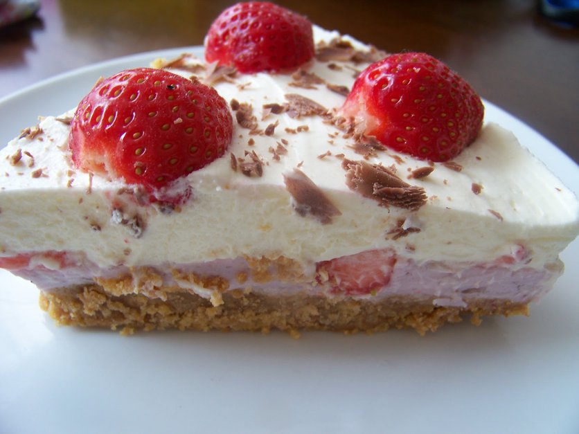 Ciastka , ja użyłam degistive ale można użyć np, be-be drobno rozkruszyć w misce. W rondelku rozpuścić masło, lekko ostudzić i przesypać do niego ciastka. Dokładnie wymieszać, aby cały tłuszcz wchłonął. Na dnie tortownicy wyłożonej papierem do pieczenia, rozprowadzić kruszonkę. Rozpuścić łyżkę żelatyny w 100 ml gorącej wody. Do jogurtu – ja użyłam leśnego, ale można zastąpić go innym- dodać ostudzoną żelatynę i dokładnie wymieszać. Przelać jogurt na ciastka i wstawić do lodówki na 20 minut. Truskawki umyć i pokroić w plastry, ułożyć na jogurcie. Kolejną łyżkę żelatyny rozpuścić w 50 ml wody, ostudzić, dodać do śmietany kremówki i ubić na sztywno, wsypać cukier puder i jeszcze chwilę ubijać. Przełożyć do tortownicy. Wstawić do lodówki do całkowitego stężenia. Wierzch dekorować kawałkami truskawek oraz wiórkami czekolady. Smacznego:)