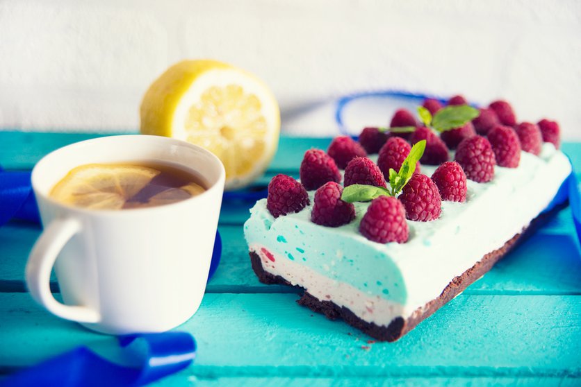 Na upieczone i wystudzone ciasto wylewamy masę z galaretki czerwonej, a następnie masę z galaretki niebieskiej. Wierzch dekorujemy malinami (można także użyć lisków mięty). Wstawiamy do lodówki, aby ciasto stężało.