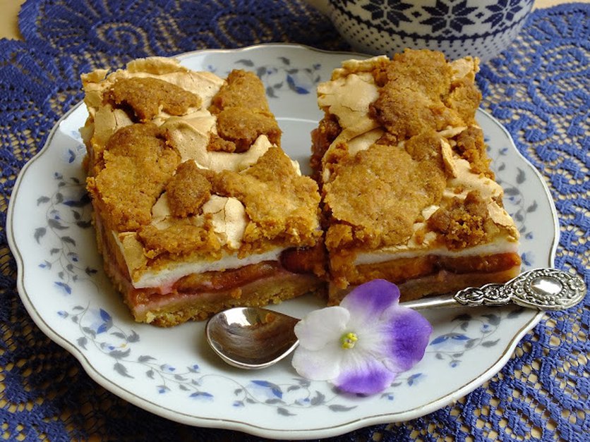 Na śliwki wykładamy bezę i wyrównujemy powierzchnię.