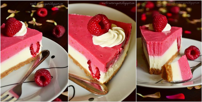 Z kolejnymi 4 łyżeczkami żelatyny zrobić to samo, co wcześniej. Maliny zblednować razem z cukrem. Wymieszać z jogurtem greckim, pod koniec dodać żelatynę cały czas mieszając (ja to wszystko zrobiłam w blenderze). Wylać na masę śmietankową. Wstawić do lodówki.