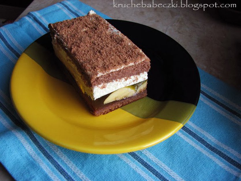 Ciasto - marmolada - przekrojone na pół banany - galaretki - większa część masy śmietanowej - ciasto - druga część mniejsza masy śmietanowej - posypujemy startą czekoladą