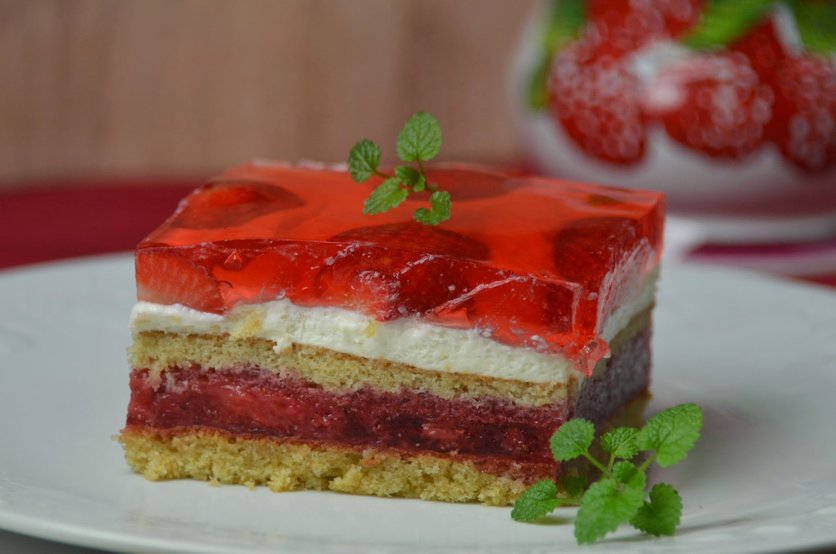 Biszkopt, masa truskawkowa, biszkopt, masa z bitej śmietany, truskawki, zalać tężejącą galaretką.