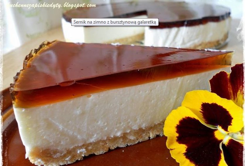 Dno tortownicy o średnicy 24 cm z braku papieru do pieczenia wyłożyłam folią aluminiową. Ciasteczka wsypałam do miski i rozgniotłam na okruchy drewnianym tłuczkiem. Masło rozpuściłam w rondelku, pilnując, żeby się nie zagotowało, wlałam je do okruchów i dłonią zagniotłam „ciasto”. Masę wyłożyłam (właściwie przesypałam) do tortownicy, równomiernie rozprowadziłam na dnie i docisnęłam dłonią tworząc równą warstwę. Tortownicę odstawiłam do lodówki. Żelatynę rozpuściłam w 1/3 szklanki wrzącej wody i odstawiłam na bok, żeby troszkę przestygła. W tym czasie na gładką masę zmiksowałam twaróg, jogurt, cukier puder i sok cytrynowy. Cienkim strumieniem, bez przerwy miksując, wlałam przestudzoną żelatynę. Miksowałam razem jeszcze chwilkę. Masę serową przelałam do tortownicy i odstawiłam do lodówki. Galaretkę rozpuściłam w 1,5 szklanki wrzącej wody, a kiedy przestygła i zaczęła tężeć, delikatnie wylałam ją na stężałą masę serową. Tortownicę ponownie odstawiłam do lodówki.
