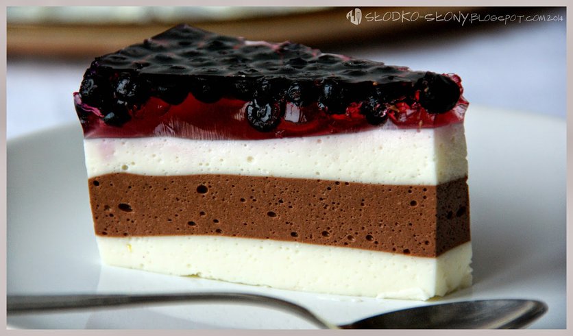 Tortownicę o średnicy ok. 21 cm obłożyć od zewnątrz folią aluminiową. Wylać do formy warstwę waniliową i wstawić do lodówki na ok. 30 min., żeby trochę stężała. Następnie wylać masę kakaową i ponownie wstawić do lodówki na 30 min. Na koniec wylać masę cytrynową i wstawić do lodówki. Przygotować galaretkę i odstawić, żeby zaczęła tężeć. Kiedy galaretka będzie lekko tężała wylać ją na ciasto. Do galaretki wsypać jagody tak, żeby pokryły cały wierzch i wstawić do lodówki na minimum 2h.