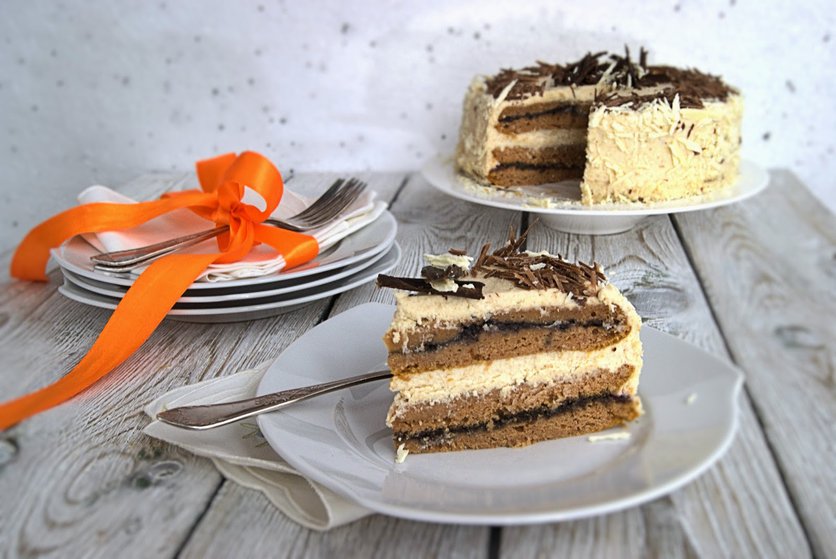 Blaty wyjąć z form, każdy przekroić na dwa cieńsze krążki. Na pierwszym rozsmarować połową konfitury czeremchowej z cassisem. Nakryć drugim, na wierzchu rozsmarować 1/3 kremu różanego. Położyć kolejny krążek, rozsmarować konfiturę. Na ostatnim rozsmarować pozostały krem.