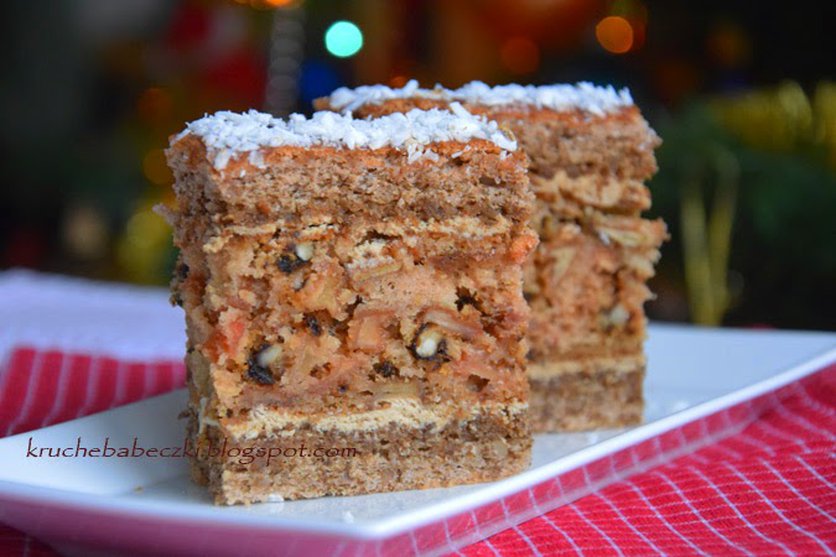Przełożenie ciasta: Ciasto orzechowe - masa - wkładka bakaliowa - masa - ciasto orzechowe - masa - kokos