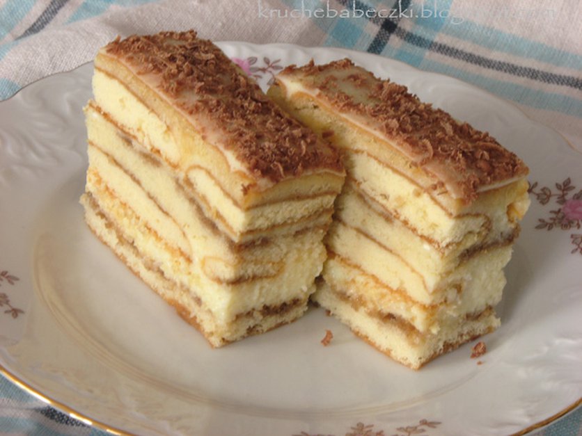 Białka ubić na sztywna pianę, do ubitych dodawać powoli cukier, następnie po jednym żółtku. Na koniec mąkę wymieszaną w proszkiem do pieczenia, dokładnie wymieszać. Piec w 180 stopniach 30-40 minut. Po ostygnięciu przekroić na 3 placki.