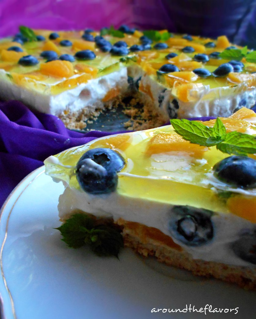 Jogurtowy serniczek na zimno z borówką i brzoskwinią