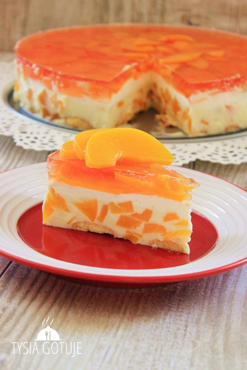 Pokrojone brzoskwinie układam na warstwę śmietanową i zalewam je tężejącą galaretką brzoskwiniową. Całość należy schłodzić w lodówce kilka godzin, ja zostawiłam na całą noc.