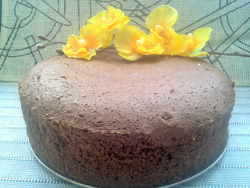Oddzielamy białka od żółtek. Białka ubijamy na sztywno. Potem partiami dodajemy cukier i cały czas miksujemy. Następnie dodajemy po 1 żółtku cały czas miksując. Dodajemy również olej rzepakowy i chwilę miksujemy. Następnie dodajemy razem przesiane obie mąki, kakao i proszek do pieczenia. Mieszamy delikatnie łyżką i po połączeniu się składników przelewamy ciasto do tortownicy posmarowanej odrobiną oleju. Wstawiamy do nagrzanego piekarnika i pieczemy przez 1 godzinę w temperaturze 180 stopni. Po wyjęciu z piekarnika "upuszczamy" ciasto na podłogę aby wyszła z niego para wodna. Następnie delikatnie odcinamy od boków formy biszkopt, wyjmujemy z tortownicy i studzimy.