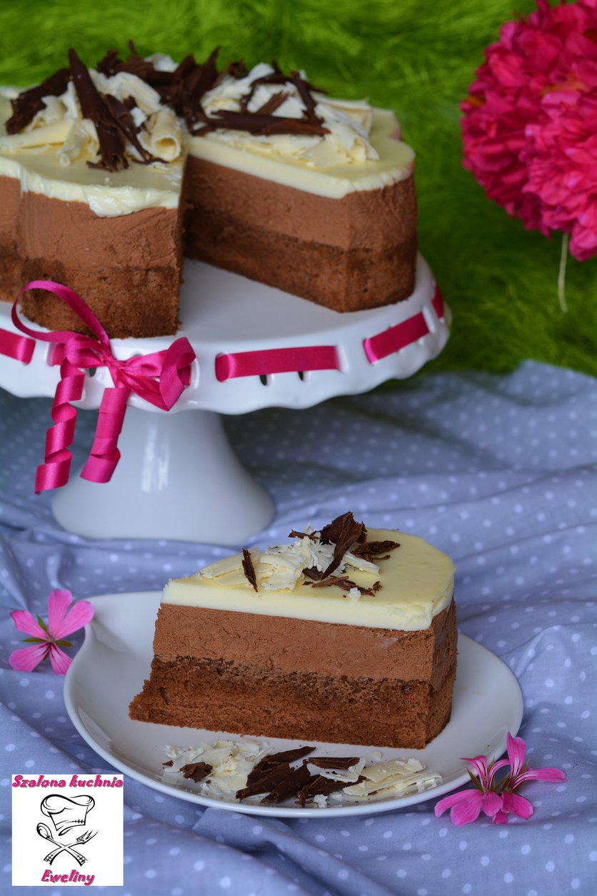 Biszkopt przełożyć do tortownicy, nasączyć ponczem, wylać warstwę musu ciemnego, wstawić do lodówki na około 30 minut. Po tym czasie wylać warstwę musu białego i ponownie wstawić do lodówki. Na wierzchu ciasto udekorować czekoladowymi rurkami.