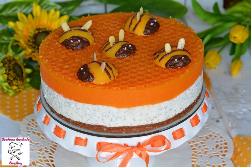 4. Po tym czasie delikatnie zdjąć folię, udekorować pszczółkami zrobionymi z brzoskwiń.