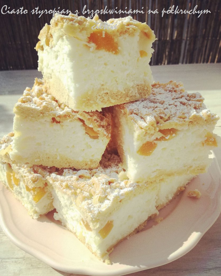 Ciasto styropian z brzoskwiniami z wyglądu do złudzenia przypomina sernik na półkruchym cieście. Masa serowa jest na bazie jogurtów brzoskwiniowych i naturalnego jogurtu typu greckiego, połączonych z wiórkami kokosowymi, co miejscami po upieczeniu przypomina właśnie styropian. Ciasto możemy wzbogacić owocami, a w tym przepisie wylądowały brzoskwinie.
