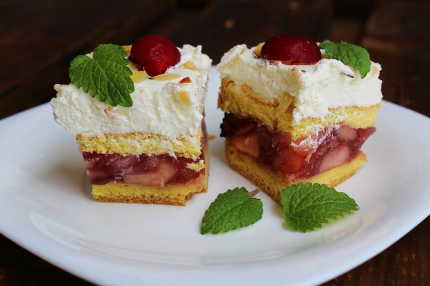 Biszkopt z masą jabłkowo- wiśniową i bitą śmietaną