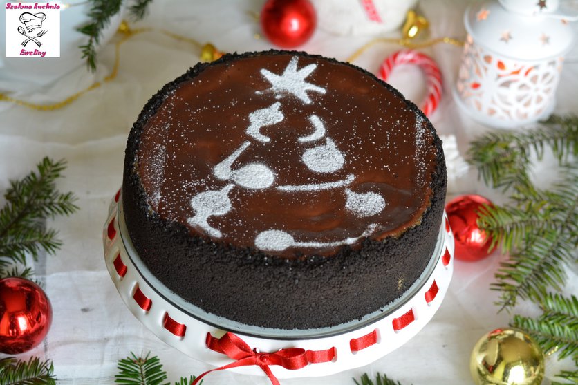 4. Wierzch seromakowca polać polewą i ponownie wstawić do lodówki. Przed podaniem wierzch ciasta udekorować posypując cukrem pudrem, przy użyciu szablonu w kształcie choinki.