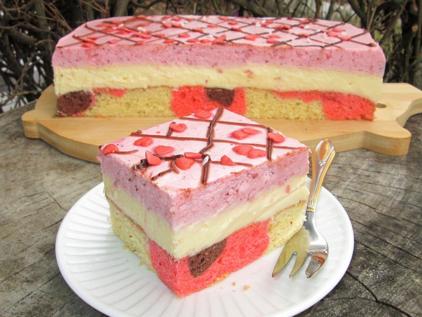 Kremowy sernik z truskawkową pianką na kolorowym cieście-sernik wiosenny