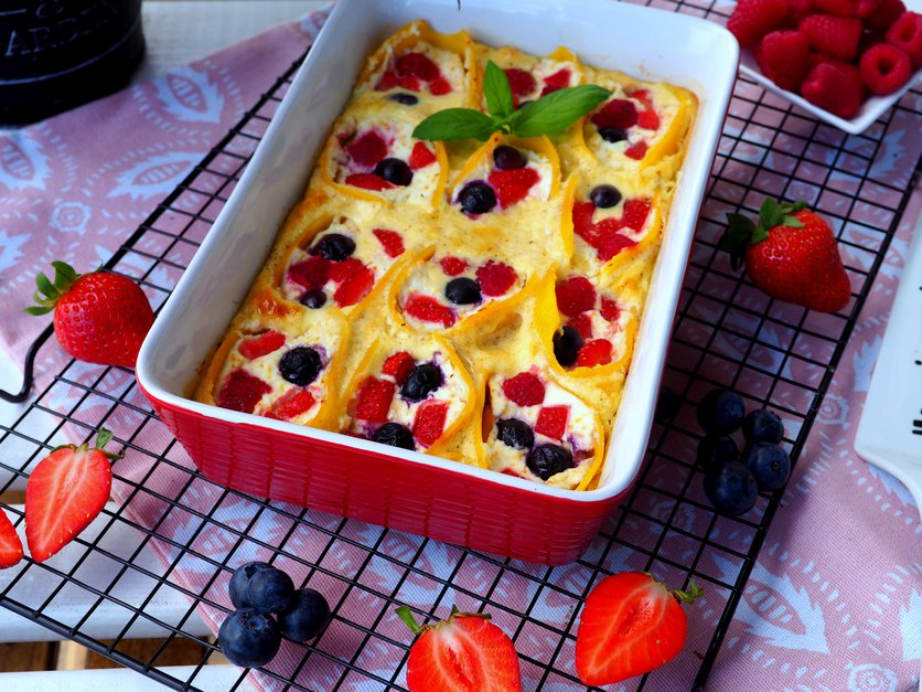 ZAPIEKANE MUSZLE MAKARONOWE Z SEREM I OWOCAMI
