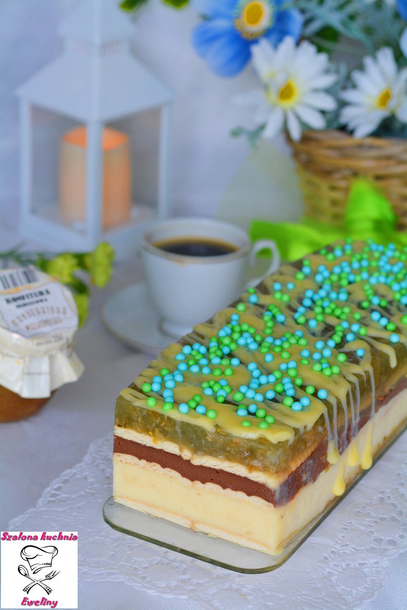 5. Czekoladę rozpuścić w kąpieli wodnej, polać ciasto, udekorować kolorową posypką.