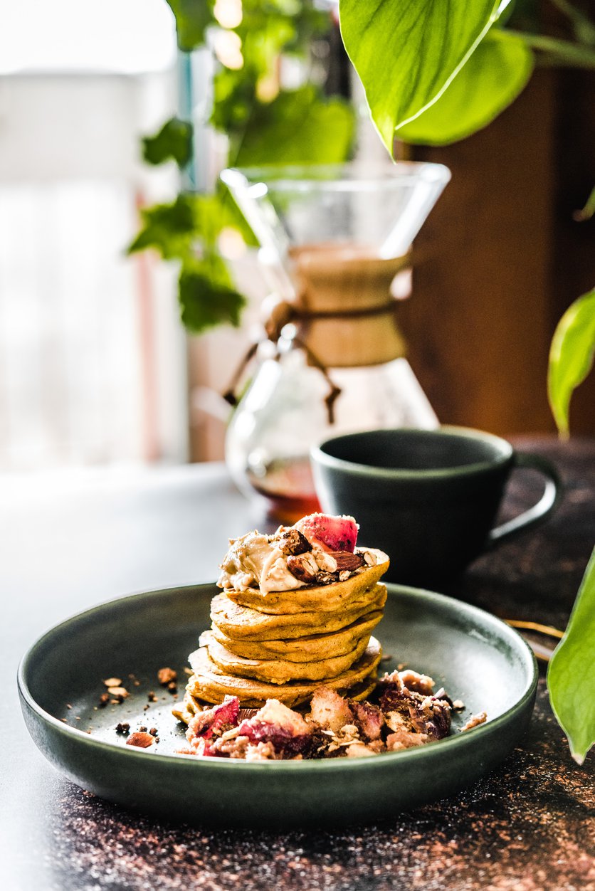 Orkiszowe placuszki dyniowe z karmelizowanymi śliwkami i masłem orzechowym