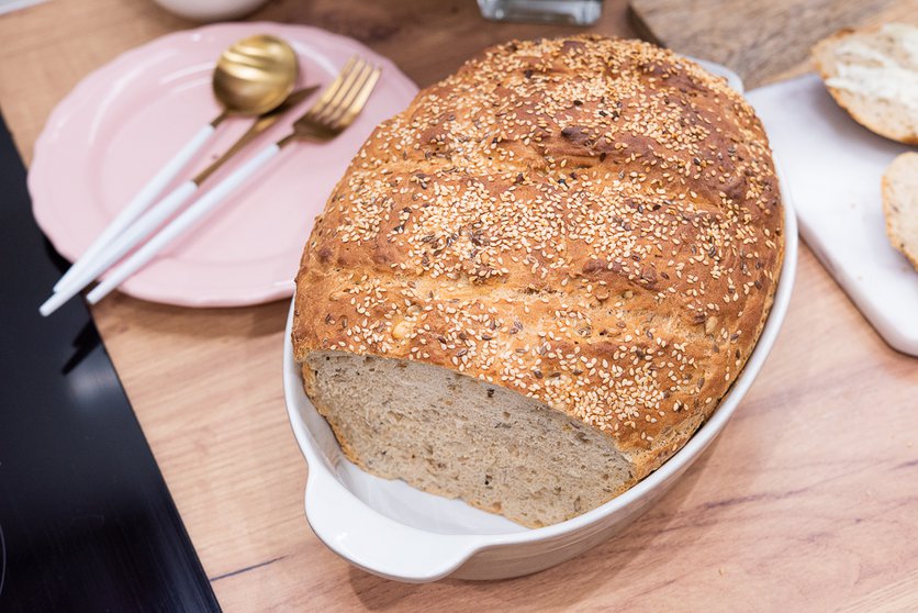 Chleb z garnka z prażoną cebulką, słonecznikiem i sezamem