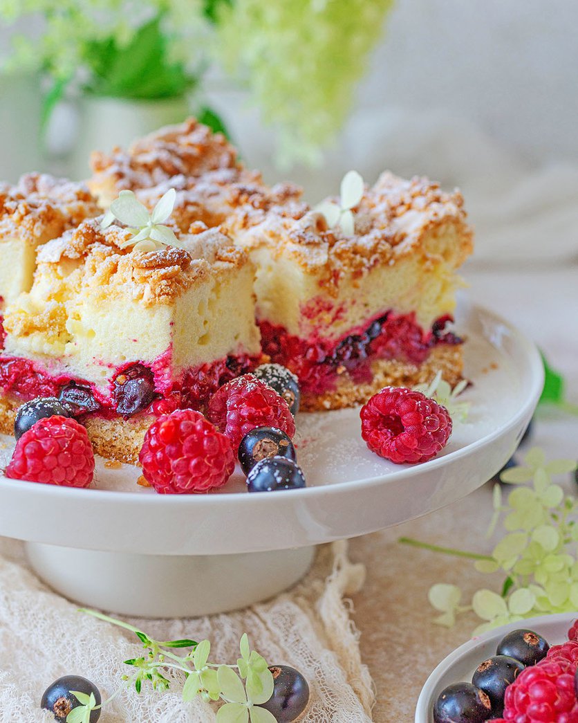 Kruche ciasto z owocami i budyniową pianką bezową