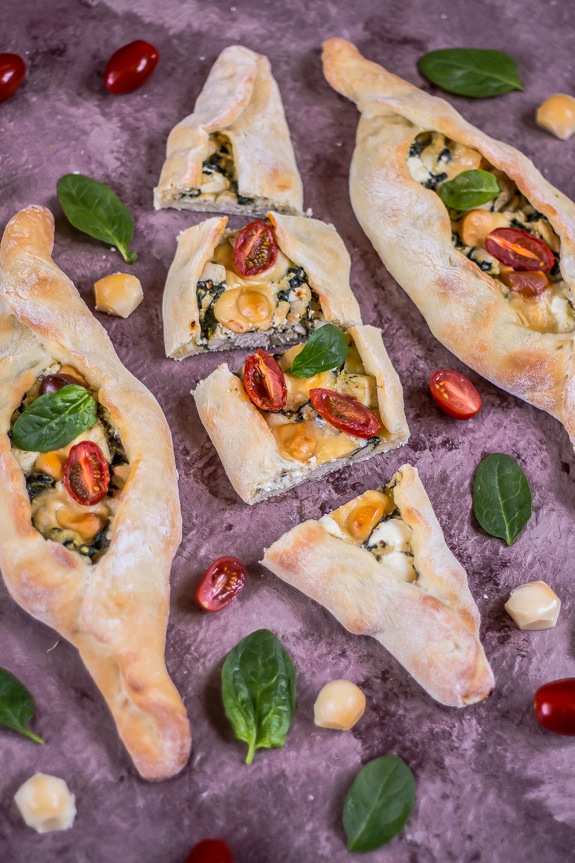 Tureckie pide ze szpinakiem, fetą i kurczakiem.