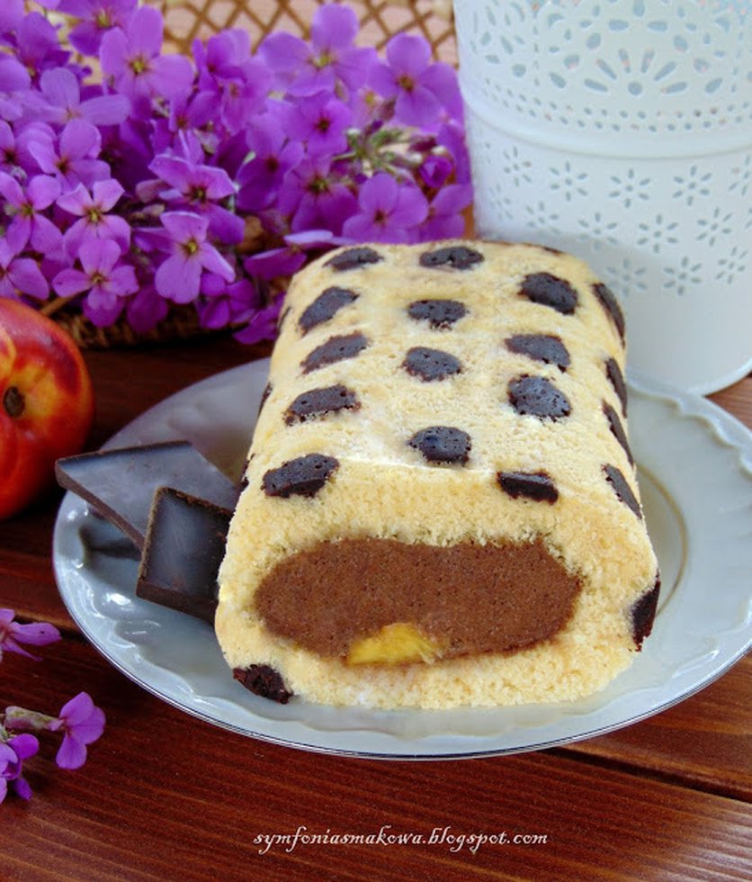Rolada w kropeczki z musem czekoladowym i nektarynką.
