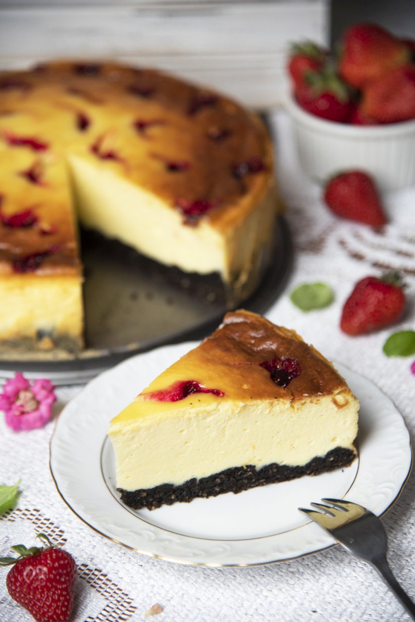 Sernik na kakaowym spodzie z truskawkami