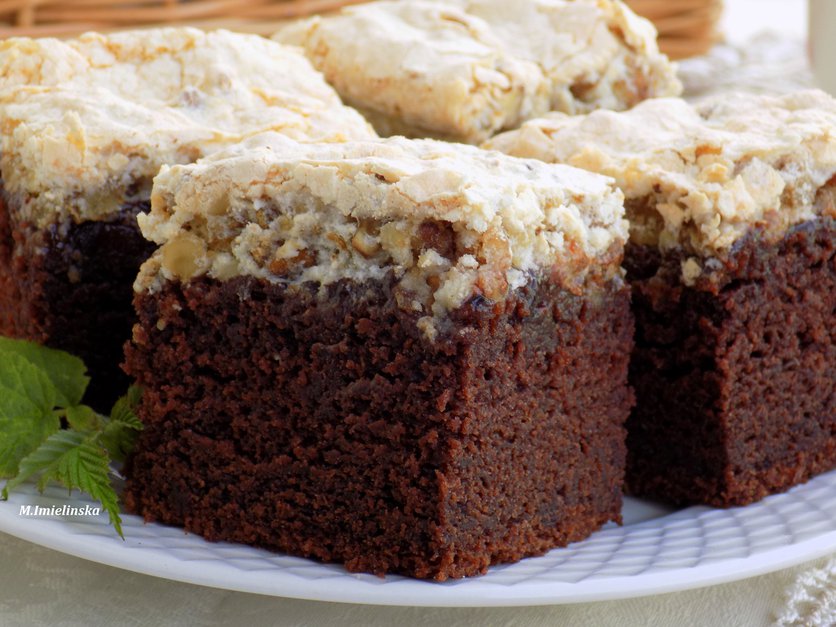 murzynek na kwasnym mleku (z powidłami i bezą orzechową)