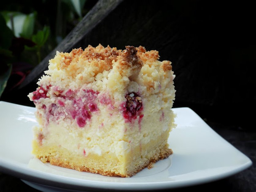 Sernik z malinami i kruszonką kokosową