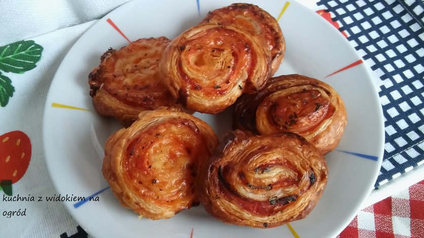 Rollsy francuskie z szynką i serem. Zakręcone ślimaczki z ciasta francuskiego.
