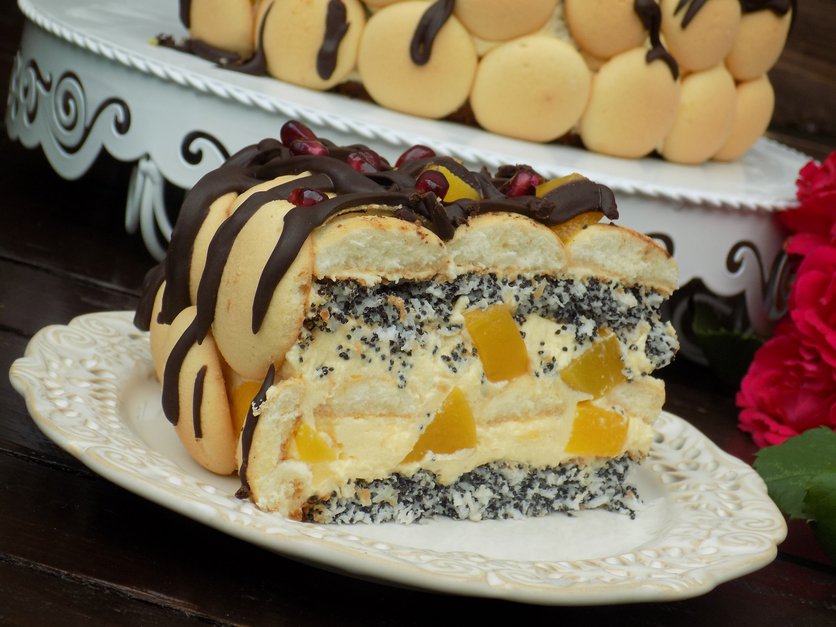 torcik makowy z kremem i brzoskwiniami
