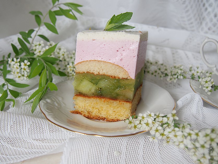 Ciasto z truskawkami, warstwą jabłek i budyniową pianką