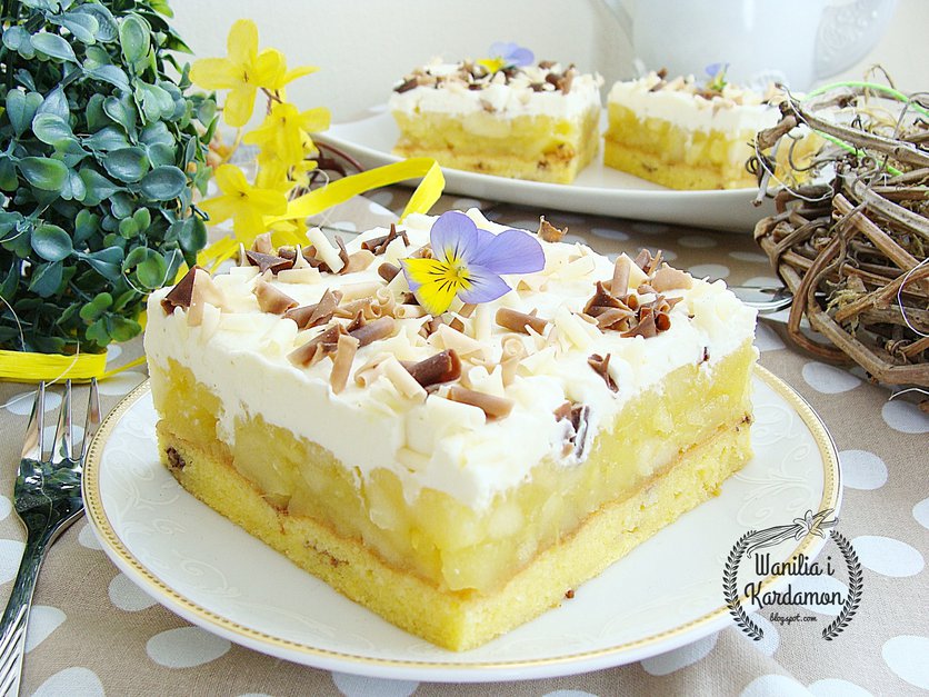 Puszysty biszkopt z papierówkami pod chrupiącą bezą