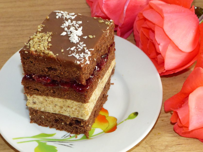 Piernik z kremem orzechowym i dżemem wiśniowym