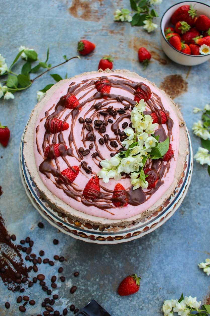 Sernik mokka ze świeżo mieloną kawą i musem truskawkowym