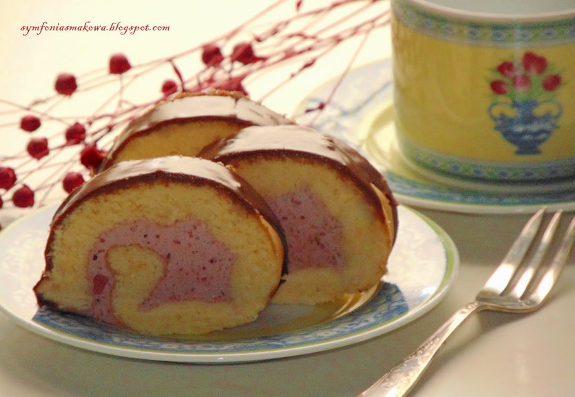 Rolada biszkoptowa z masą truskawkową i czekoladową polewą.