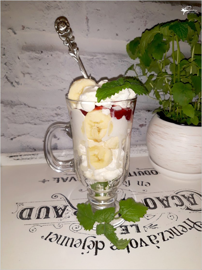 Deser „słodki bałagan” z bezą, bananami i malinową konfiturą