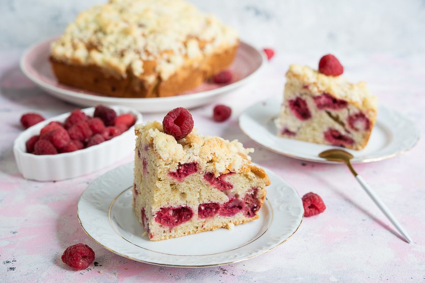 Ciasto widelcem mieszane z czarnymi malinami i kruszonką.