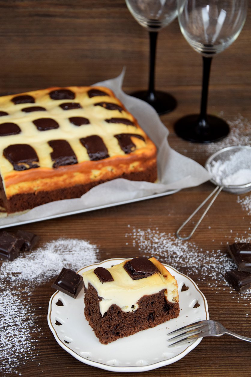 Sernik z brzoskwiniami w czekoladowym cieście