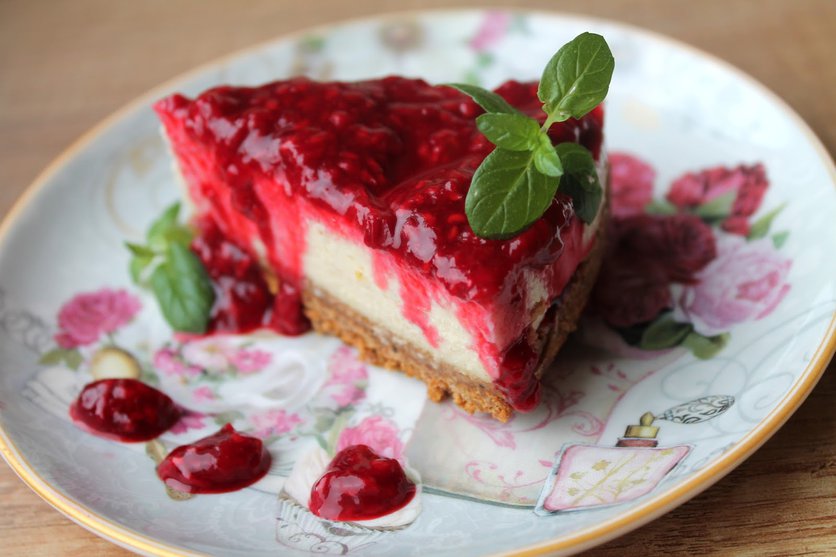 Sernik z nerkowców na spodzie z korzennych ciasteczek z musem malinowym