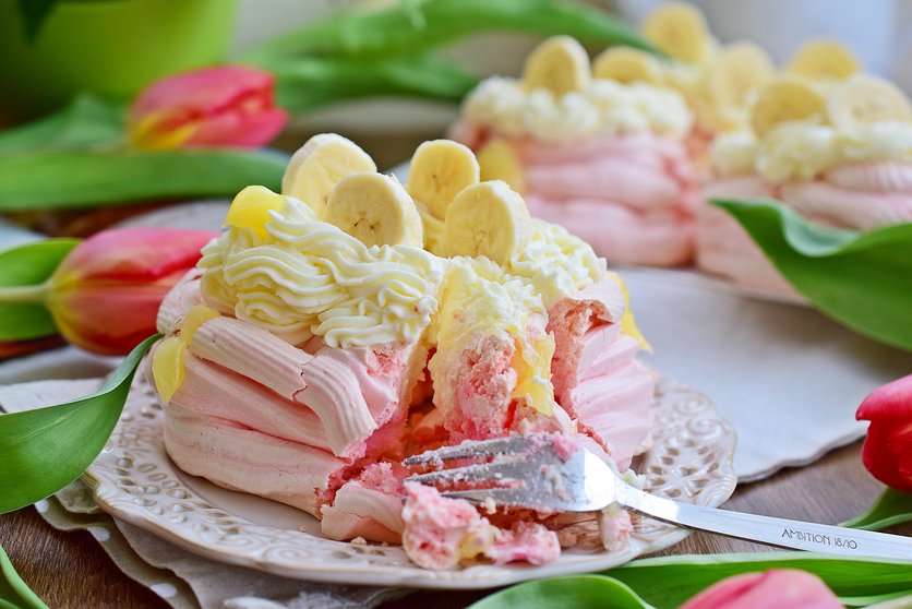 Gniazda bezowe z cytrynowym kremem i bananami